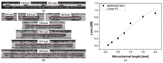 To determine the usefulness of the proposed method for modifying the ARHCF structure with the aid of the ultrafast laser micromachining process, we have investigated the possibility of cutting long microchannels with a length of up to ~2 mm. Here, 35 microchannels were made at the output end of a 15 m-long ARHCF (the same fiber as in the previous experiment) in 7 sections, each containing 5 microchannels with different lengths and fixed widths equal to 30 µm. The distance between the sections was 10 cm and the microchannels were separated by 1 mm. The polymer coating was removed locally, mechanically using a scalpel prior to laser processing. All microchannels were made using an aspherical lens for optimal process parameters, as defined at the beginning of this section. Figure 9a,b shows fabricated microchannels with lengths of 0.1, 0.25, 0.5, 0.75, 1, 1.5 and 2 mm. The quality of the fabricated microchannels was at the same level regardless of their length. In-depth analysis of the fabricated structures has shown that no damage occurred to the internal capillaries that form the actual fiber cladding. The impact of a microchannel length on the transmission properties of the ARHCF was determined using a similar approach to that previously described in Section 3.1. The optical power at the fiber output was measured after individual sections of the microchannels were cut off. The results are plotted in Figure 9c. It can be seen that microchannels with a length below 0.5 mm introduce very low transmission loss, not exceeding 0.1 dB. For microchannels with lengths greater than 0.5 mm, an increase in light attenuation was observed. The higher loss level observed in the case of longer microchannels was caused by the accumulation of debris in the vicinity of the processing area, which was pushed into the core by the air flow used to clean the processed region.