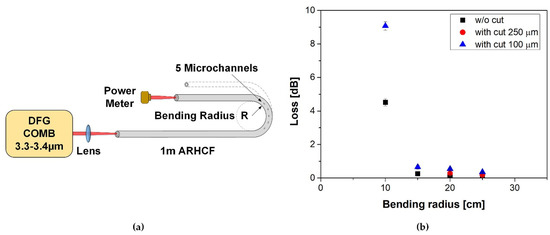 Bending loss of the ARHCF with microchannels: (a) schematic of the measurement setup and (b) results of measurements plotted as a function of the bending radius.