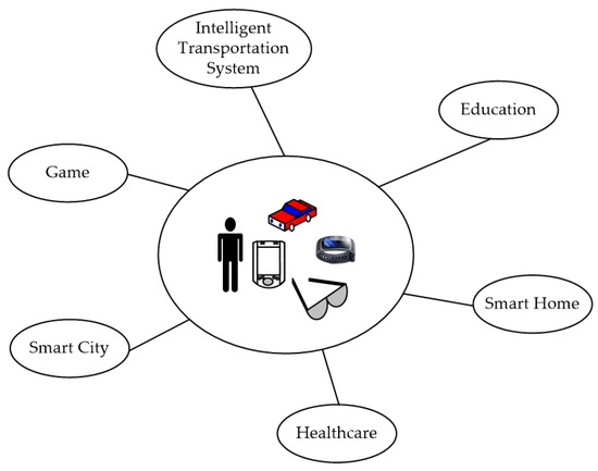 In recent years, as businesses using various IoT devices have become active in the IoT environment, many cases in which personal information is stored and processed in IoT devices have developed [4,9,10]. As shown in Figure 1, education, healthcare, smart cities, intelligent transportation system, and games are examples of IoT applications that make up a personal environment. For example, it is possible to store a user-specific setting value of a healthcare device and then reprocess it, or to construct a user’s healthcare environment using the user’s setting value stored in the device.