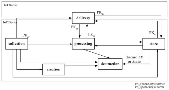 In this paper, in order to manage the personal information collected by IoT devices in IoT application services, we define a lifecycle of personal information according to the flow of information as shown in Figure 2. This figure shows the lifecycle stage in which personal information is processed within the IoT device and the stage in which it is delivered to the IoT server from the IoT device. First, data about the user’s movement or surrounding environments are created and collected by the IoT device. The collected data are transferred to the IoT server or processed to provide application services. Alternatively, the data may be destructed immediately after they are collected, or they may be stored within the IoT device for use in the next service. The data can be processed or stored in the IoT device and then delivered back to the IoT server or reprocessed. In the flow of information according to the lifecycle process shown in Figure 2, it is necessary to securely protect the personal information of users managed by the IoT device. In particular, it is important to securely process a user’s personal information for each stage of the lifecycle in IoT devices.