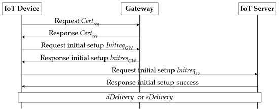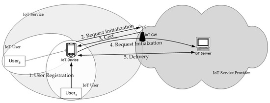 A IoT device requires an initial setup with a user and initial setup with an IoT server through a gateway. Figure 4 shows these procedures.