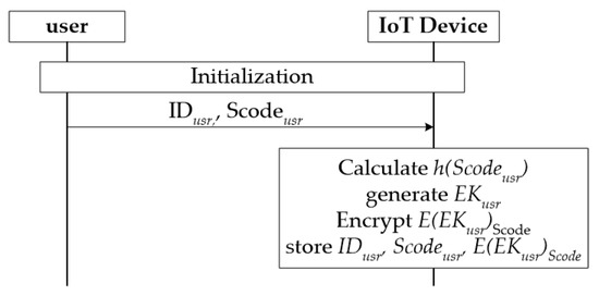 Except for the authentication between the user and the IoT device, which is not covered in this paper, after the user registers the user ID and secret code on the IoT device, the procedure of the IoT device generating the user’s encryption key and storing it using the secret code is as follows.
