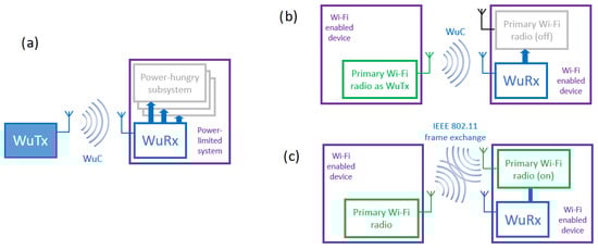 (a) Generic Wake-up Radio (WuR) system, where a Wake-up Transmitter (WuTx) sends a Wake-up Call (WuC) to a Wake-up Receiver (WuRx); (b) Wi-Fi-based WuR system where a Wi-Fi radio is used as a WuTx; (c) Wi-Fi-based WuR where primary radios are used for a regular data frame exchange.