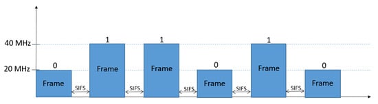 For the WuTx proposed in this research, first, a legacy IEEE 802.11n transmitter can be used, sending frames during a TXOP employing two different signal bandwidths, thus coding two different symbols, each of them composed by one bit (cf. Figure 3). On the other hand, for an IEEE 802.11ac/ax transmitter, up to four different bandwidths for frame transmission during a TXOP can be used, thus allowing four different symbols, each of them carrying two bits (cf. Figure 4). Obviously, WuTx with the IEEE 802.11ac/ax option also allows the one bit per symbol coding of Figure 3, but other combinations using two bandwidth values could be used to increase the distance between symbols (e.g., 20 and 80 MHz, or 20 and 160 MHz). Note that the number of frames involved in the TXOP of Figure 3 and Figure 4 are only for the sake of example.