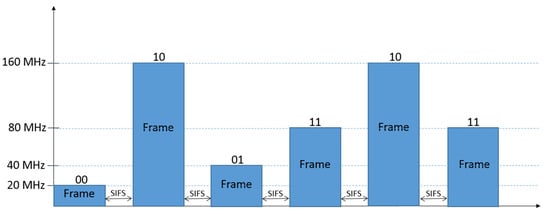 Example of two bits per symbol coding with four different signal bandwidths. A frame with 20 MHz of signal bandwidth representing bits “00”, a frame using 40 MHz represents bits “01”, 80 MHz corresponds to “11”, and 160 MHz to “10”.