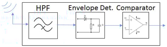 As stated, the proposed Wake-up Radio system works with a simple WuRx design, provided that it is capable of distinguishing transmissions using different bandwidths in Wi-Fi frequencies (i.e., 2.4, 5 GHz bands). The WuRx presented in this paper is composed of three components: High-Pass Filter (HPF), envelope detector, and comparator (Figure 5). The HPF is the key component of this WuRx, as it is responsible for filtering the incoming signal in order to distinguish among the different signal bandwidths. OFDM signals with different bandwidth values contain a different number of subcarriers. In the case of IEEE 802.11n and 11ac, for example, 20 MHz signals are built of 64 subcarriers, 40 MHz signals of 128 subcarriers, 80 MHz signals of 256 subcarriers, and 160 MHz signals of 512 subcarriers, containing the signals with larger bandwidth also the subcarriers of the signals with shorter bandwidth (i.e., the 512 subcarriers of the 160 MHz signal include the 64 subcarriers of the 20 MHz, the 128 subcarriers of the 80 MHz signal, and the 256 subcarriers of the 80 MHz signal). Given the aforementioned characteristics of OFDM signals, the usage of an HPF with the appropriate cut-off frequency will allow the differentiation among signals with different bandwidths, i.e., a different number of subcarriers. In this way, for instance, a 20 MHz signal can be filtered using a cut-off frequency above the frequency components of its 64 subcarriers, whereas signals with larger bandwidth values will still maintain high signal levels at this filter output.