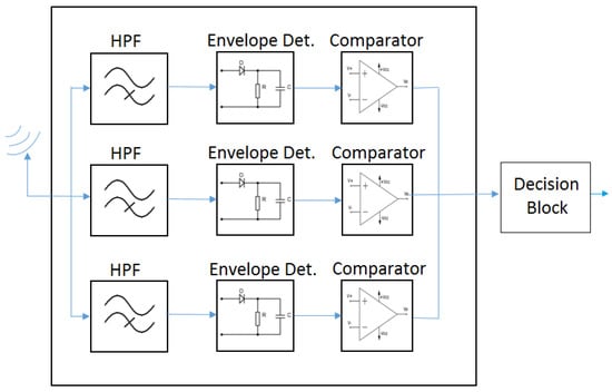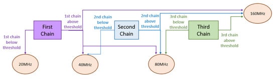 For the scenario with four different symbols and two bits per symbol, the WuRx of Figure 5 is insufficient to distinguish among signals with four different bandwidth values. Thus, the WuRx of Figure 6 is proposed, which includes three receiver chains as the one shown in Figure 5 and a logical decision block. The incoming signal is handled by each receiver chain, being the differences among chains, the cut-off frequency of the filters, and the threshold value of the comparator blocks. The objective of the first filter and chain consists in distinguishing between a 20 MHz signal and signals with larger bandwidth values. The second filter and chain aim at differentiating between 40 MHz signals and signals above 40 MHz of bandwidth. The third filter and chain target is to discriminate between an 80 MHz signal and a 160 MHz signal. Finally, the outputs of these three chains consist of the inputs of the logical decision block, which takes the decision on the signal received and, thus, on the symbol and corresponding bit decoding. If the output of the first chain is below the corresponding threshold, the decision is that a 20 MHz signal is received, regardless of the output of the second and third chains. On the other hand, if the output of the first chain is above the corresponding threshold, and the output of the second chain is below the threshold, then the decision is that a 40 MHz signal is received, regardless of the output of the third chain. If the outputs of the first and second chains are above the corresponding thresholds and the output of the third chain is below the threshold, the decision is that an 80 MHz signal is received. Finally, in case the outputs of the three chains are above the corresponding thresholds, then it is decided that a 160 MHz signal is received. The decision flow is illustrated in Figure 7. The choice of cut-off frequencies and threshold values (explained in the following Section 4) is crucial for the correct discrimination among signals of different bandwidths and, thus, for obtaining good WuRx performance with regard to WuC decoding.