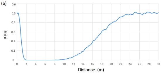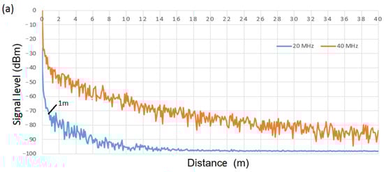 For the WuRx design, it is necessary to decide on the thresholds of the different comparator blocks. For this issue, we consider propagation model B from [], as it is the most restrictive (model B applies to indoor, residential, or small office environments). We begin with the WuRx design of Figure 5 (scenario with two symbols and one bit per symbol) and choose a fifth-order Chebyshev filter with a cut-off frequency of 12 MHz. This filter configuration has been chosen to filter a 20 MHz signal using the lowest filter order providing enough attenuation to differentiate between a 20 MHz IEEE 802.11 signal and a signal with a larger bandwidth. The signal level at filter output for a 20 MHz and a 40 MHz IEEE 802.11 signal is shown in Figure 8a as a function of the distance between transmitter and receiver. Note that if differentiation between a 20 MHz and a 40 MHz signal is successfully achieved, it is also feasible between a 20 MHz signal and a signal with bandwidth larger than 40 MHz (i.e., 80 MHz and 160 MHz). A transmission power of 1 W is considered at 5 GHz. From this figure, we observe around 30 dB of difference between output signals at 1 m of distance and, thus, we establish the 20 MHz signal level at 1 m (i.e., −73 dBm) as the threshold value at the comparator block. This means that a received IEEE 802.11 signal with a signal level at the filter output below this threshold will be decoded as a 20 MHz signal; otherwise, it will be decoded as a 40 MHz signal, thus leading to an effective operational range covering distances from 1 m to 12 m. If we consider a stream of 10,000 random bits, where IEEE 802.11 frames of 20 MHz of bandwidth encode WuC bits with a value of “0”, and frames of 40 MHz of bandwidth encode bits with a value of “1”, Figure 8b shows corresponding Bit Error Rate (BER) at the output of WuRx of Figure 5. As shown, BER = 0 is achieved in the range between 1 m and around 12 m. Choosing a lower threshold value would improve the performance in short distances (i.e., <1 m), however, it will also decrease the effective range below 12 m. In this way, we choose a lower bound of 1 m, which we found reasonable for the WuR use case, where the aim is the management of remote devices beyond 1 m.