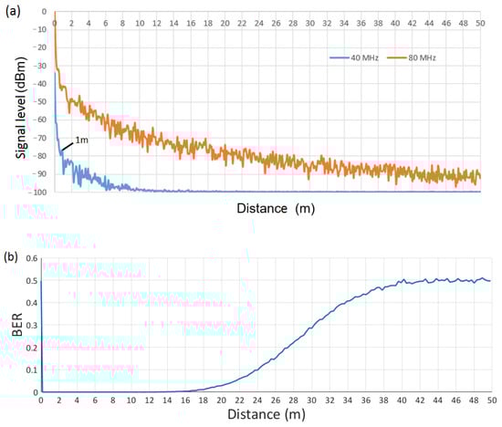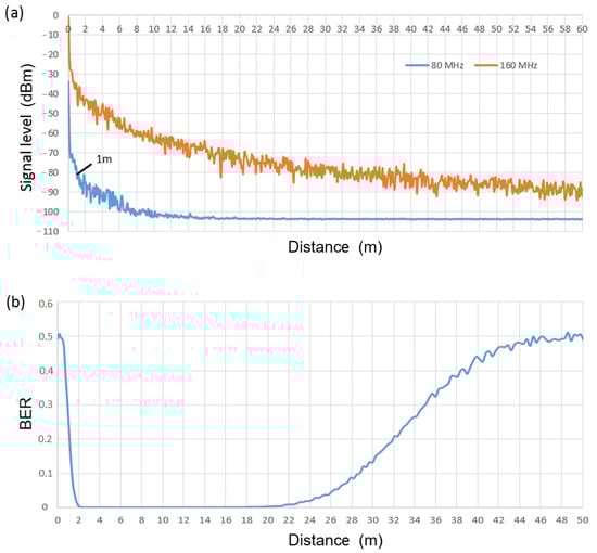 With regard to the WuRx of Figure 6 (scenario with four symbols and two bits per symbol), threshold values for the comparator blocks of second and third chains have to be defined (note that the aforementioned threshold for WuRx of Figure 5 is employed in the first chain of the WuRx of Figure 6). Following the same approach, we choose a fourth-order Chebyshev filter and cut-off frequency of 33 MHz in the second chain to filter a 40 MHz signal using the lowest filter order providing enough attenuation to differentiate between a 40 MHz IEEE 802.11 signal and a signal with a larger bandwidth. Finally, a third-order Chebyshev filter and cut-off frequency of 63 MHz is chosen in the third chain to filter an 80 MHz signal. The signal level at filter output of the second chain for a 40 MHz and an 80 MHz IEEE 802.11 signal, as a function of the distance between transmitter and receiver, is observed in Figure 9a. Note that if differentiation between a 40 MHz and an 80 MHz signal is successful, then it is also suitable with signals of bandwidth larger than 80 MHz (i.e., 160 MHz). A value of −77 dBm is chosen as the threshold at the comparator block (i.e., 40 MHz signal level at 1 m), leading to an operational range (BER = 0) from 1 m to 18 m. Corresponding BER at the output of the second chain of the WuRx of Figure 6 is shown in Figure 9b. A stream of 10,000 random bits is considered, where IEEE 802.11 frames of 40 MHz of bandwidth encode WuC bits with a value of “0”, and frames of 80 MHz of bandwidth encode bits with a value of “1”. Finally, Figure 10a shows the signal level at filter output of the third chain for an 80 MHz and a 160 MHz IEEE 802.11 signal, being −81 dBm chosen as a threshold value (i.e., 80 MHz signal level at 1 m) and resulting in an operational range (BER = 0) from 1 m to 22 m. This range can also be observed from Figure 10b, which shows BER performance at the output of the third chain of the WuRx of Figure 6, considering a stream of 10,000 random bits, with IEEE 802.11 frames of 80 MHz of bandwidth encoding WuC bits with a value of “0”, and frames of 160 MHz of bandwidth encoding bits with a value of “1”. It is important to highlight that we use the aforementioned threshold values for evaluation purposes. More than the absolute numbers obtained and used in this validation, what is crucial is to achieve enough power difference between signals of different bandwidths at the filters’ outputs. If the signal level at the input of the envelope detector needs to be above a minimum value, it can be achieved by adding an amplification step.