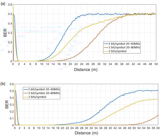 We consider a bit stream of 10,000 random bits for the one bit per symbol WuC and of 20,000 for the two bits per symbol WuC, thus, transmitting 10,000 IEEE 802.11 signals (i.e., WuC symbols) in both scenarios. Signals are generated according to the coding scheme described in Section 4. Obviously, IEEE 802.11n transmissions can only be employed for the one bit per symbol WuRx with 20 MHz and 40 MHz signal bandwidths since IEEE 802.11n does not support larger bandwidths. Moreover, note that, although the different IEEE 802.11 amendments (i.e., IEEE 802.11n/ac/ax) introduce some changes at the PHY, the generated signal for different bandwidths (i.e., 20, 40, 80, and 160 MHz) is read by the proposed WuRx of Section 4. Thus, independently of the specific PHY used at the WuTx, the WuR solution is suitable for the different amendments from IEEE 802.11n-2009 on, given that the spectral mask at different bandwidths is almost identical for all of them [,,]. Recall that the WuRx is intended to detect energy over different bandwidths, which are common to all amendments operating in the 2.4 and 5 GHz ISM bands; that is, from IEEE 802.11n to IEEE 802.11ax (both included). A transmission power of 1 W is considered at 5 GHz; therefore, we only show the evaluation at 5 GHz using an IEEE 802.11ac WuTx. We take the different alternatives into account for our evaluation and show BER performance at WuRx output as a function of the distance between WuTx and WuRx in Figure 11a,b for propagation models B and F, respectively. The largest operational range (BER = 0), from 1 m to 18 m for model B and from 1 m to 50 m for model F, is achieved by the approach using one bit per symbol encoded with 20 MHz and 80 MHz signals. The scenario with one bit per symbol employing 20 MHz and 160 MHz signals shows the same performance as for the case including 20 MHz and 80 MHz signals and, thus, it has not been included in Figure 11. The system with two bits per symbol decreases the operational range (BER = 0) from a maximum distance of 18 m to 12 m for model B, and from a maximum of 50 m to 30 m for model F. On the other hand, it allows a higher bit rate (32.81 kbps in front of 16.14 kbps and 17.26 kbps, using one bit per symbol and IEEE 802.11ac and IEEE 802.11n, respectively; 27.17 kbps in front of 13.58 kbps for IEEE 802.11ax). The worst operational range (up to a maximum distance of around 10 m for model B, and up to a maximum of 20 m for model F) is achieved for one bit per symbol and signal bandwidths of 20 MHz and 40 MHz. Slope values are smoother for the approach with better performance (1 bit/symbol 20–80 MHz), i.e., larger operational range, as the wider bandwidth difference among signals eases the differentiation between them, thus presenting a lower error rate. On the opposite, slope values are steeper for worse approaches, i.e., those with shorter operational range, as the smaller bandwidth difference between signals conduct to high error rate in the differentiation process. This could be improved with the use of more selective filters, but that increases the complexity of the circuitry.