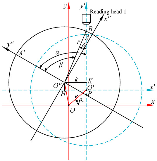 In Figure 2, the blue dotted circle indicates the circular grating radial section where the measuring point of reading head one was located (referred to as “reading section” for short). r is the radius of the radial section. The rotation center O and the geometric center O′ of the reading section generally did not coincide. The distance between these two points is the eccentricity e. According to the position of the measuring point of reading head one, two two-dimensional rectangular coordinate systems were established on the reading section, namely, the fixed coordinate system (FCS) xOy and the rotating coordinate system (RCS) x′O′y′. When the reading section rotated counterclockwise from the position of the blue dotted circle to the position of the black solid circle, α was the actual rotation angle of the shafting. The rotating coordinate system x′O′y′ rotated counterclockwise around the origin O to the coordinate system x″O″y″ position. The measuring point of reading head one changed from A to B. β is the measured value of reading head one. δ is the eccentricity error. Evidently, δ = β − α. The coordinates of each point before and after rotation in Figure 2 are shown in Table 1.