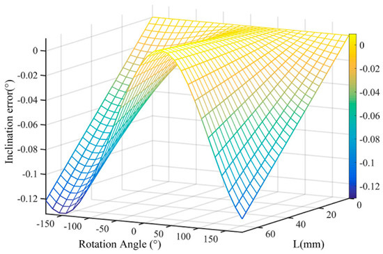Let r = 100 mm, θ = 0.1°, and θL = 30°. The shafting rotated one turn, and the value of α was from 0° to 360°. The relationship among the inclination error δL, L, and the rotation angle α is shown in Figure 5.