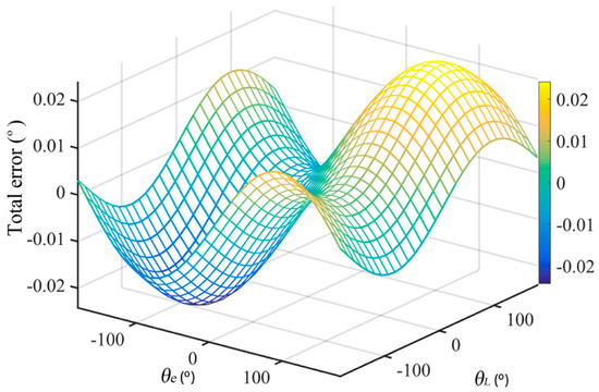 Let r = 100 mm, L = 35.5 mm, θ = 0.1°, and θL = θe + 30°. The shafting rotated one turn, and the value of α was from 0° to 360°. The angle measurement error data calculated by using the proposed total error model (Equation (16)) are shown in Table 4.