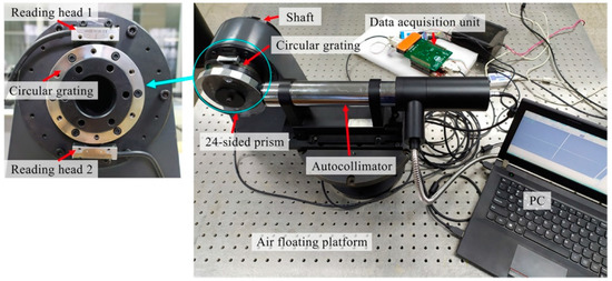 The calibration and compensation experiment system for the angle measurement error of the circular grating included a shaft, a circular grating, an autocollimator, a 24-sided prism, a data acquisition unit, and an air floating platform, as shown in Figure 7. The angular measurement accuracy of the circular grating was 1.05″ and the resolution was 0.21″. The accuracy of the 24-sided prism was 0.5″. The accuracy of the Autocollimator was 0.5″ and the resolution was 0.01″. The sampling frequency of the data acquisition unit was 0.1 MHz. The air floating platform could isolate the vibration interference of the external environment. The 24-sided prism and the circular grating were installed on the same side of the shaft. The circular grating was equipped with double reading heads. The double reading heads were arranged on the upper and lower diameter positions of the circular grating. The parameters of the double reading heads were the same. When the shafting rotated to different positions, the data acquisition unit synchronously collected the angle measurement data of the autocollimator and the double reading heads. The measurement value of reading head one was used for the angle measurement error analysis of the single reading head. The synchronized measurement values of reading head one and reading head two were used for the measurement error analysis of the double reading heads. The error compensation method was described in detail in the next section.