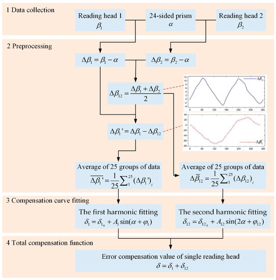 where α is the true value of the rotation angle, is the initial phase of the second harmonic, A12 is the second harmonic amplitude and is the second harmonic amplitude offset. Then, δ = δ1 + δ12 was the error compensation function of the single reading head, and Equation (23) was the error compensation function of the double reading heads.