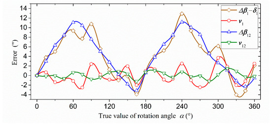 It can be intuitively seen in Figure 9 that the trend and amplitude of the error curve after the first harmonic compensation of reading head one and the error curve of the mean value of the double reading heads were basically the same. After the second harmonic compensation, the trend and amplitude of the error curve of reading head one were also very close to the error curve of the mean value of the double reading heads. The experimental results showed that the compensated angle measurement accuracy of the single reading head was consistent with that of the double reading heads. Moreover, comparing the data of v1 and Δβ12, we could also see that the error of the single reading head after two progressive compensations was much smaller than the error of the mean value of the double reading heads without compensation. It showed that the angle measurement accuracy of the single reading head after the secondary compensation was higher than the angle measurement accuracy of the mean value of the double reading heads without compensation.