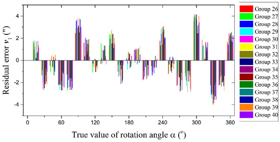 Next, we used the remaining 15 groups of measurement data to verify the error compensation function obtained from the previous 25 groups of measurement data. The residual error v1 of reading head one after two progressive compensations is shown in Figure 10.