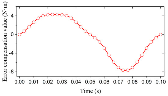 In the simulation, let the swing angle amplitude be 90°, the frequency be 10 Hz, and the initial phase be 0°. Then, . Let the moment of inertia J be 2 kg·m2 and, using the compensation data in Table 6, we could obtain the dynamic torque compensation curve as shown in Figure 11. In Figure 11, the peak-to-peak value of the torque error compensation curve was 11.96 N·m. The simulation results showed that the application of the error compensation method shown in Figure 8 could improve the accuracy of the dynamic torque calibration system.
