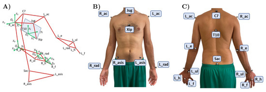 Human motion recordings were performed with an optoelectronic marker-based system, i.e., BTS Smart DX [24]. Eight cameras (resolution 1.4 Mpixel) were geometrically calibrated to capture the motion of reflective elements placed on volunteers’ anatomical landmarks with a frame rate of 60 Hz and an accuracy less than mm over a 3 m × 2 m m area. Nineteen reflective markers were placed on specific anatomical landmarks of the subject’s upper limbs and trunk. The positioning partially followed the methodology adopted by Rab et al. in [25]. The adopted marker set is shown in Figure 1. With respect to [25], the markers placed on the head were removed while three more were added: one marker on the middle finger distal phalanx of both hands, one marker under the xiphoid process (Xip) and one marker at the level of the T10 vertebra. These last two markers were useful to extract trunk posture information, respectively.