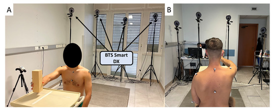Front and back view of the adopted experimental setup for the acquisition sessions are reported in (A,B), respectively. The BTS Smart DX optoeletronic system recorded the motion of the subject while performing working gestures.