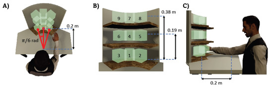 Top, front and lateral view of the shelf unit are shown in (A–C), respectively. The positions of the targets to be reached are outlined.
