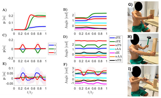 The reported trajectories are referred to the target position number 4, 8 and 4 (see Figure 3) for the handling goods (Figure 4A,B), the hammering (Figure 4C,D) and the screwing (Figure 4E,F) tasks, respectively.