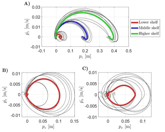 Phase plane plots are shown in Figure 5. The thin grey lines are all the collected data whereas the thick lines are the averaged trajectories. In Figure 5A, the pick and place behaviour of the handling goods task in the phase plane of the motion recorded toward the targets number 1, 4, and 7 of Figure 3, is highlighted. In this plot, the dynamic evolutions of the displacement along the Z axis according to the different target positions are distinguished. The red line stands for the lower shelf, blue for the middle one and green is for the highest one. Figure 5B,C show the phase planes for the hammering and screwing working gestures executed with the nail and the screw, respectively, located in the target position number 4 of Figure 3. The displacements along the Z and the X axes were studied, respectively, for the hammering and the screwing sub-tasks since they are the most representative ones.