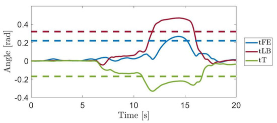 The trunk rotations collected during the additional recording to assess the applicability of the WGD as a tool for posture evaluation are shown in Figure 6. In particular, trunk angles exhibited by the volunteer during the execution of a handling goods task are reported. In the figure, the dashed lines are the maximum values of the trunk rotations reported in Table 4. Such threshold values are rad for the tFE, rad for the tLB and rad for the tT degrees of freedom.