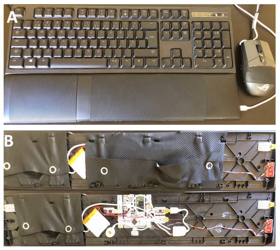 Prototype of the keyboard armrest, highlighting (A) the positioning of the electrodes and (B) the data acquisition system.