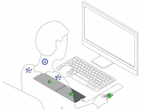 Our proposed approach consists of a full-scale model of a gaming keyboard armrest and mouse, Figure 1, with the main areas that come in contact with the skin wrapped in a conductive nappa. The sensor and data acquisition system is the same used in [], allowing the keyboard armrest to transmit the collected signals via Bluetooth to a receiver (i.e., a computer or a smartphone).