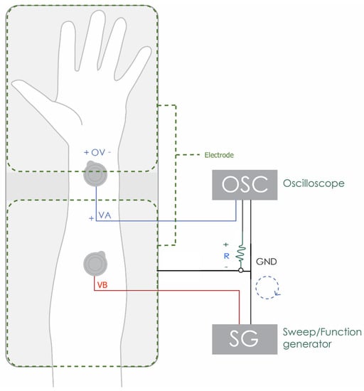 Some factors such as age, temperature, humidity, moisturizers and sun exposure can cause an influence on the impedance of the skin, which generates a change in the quality of the ECG signal. This impedance can be described as the resistance of alternating current electrical signals to pass through, and is measured as the voltage/current ratio. The skin becomes a part of the circuit when the electrode is in contact with the skin surface. If there is a high skin impedance, it causes the signal to be compromised, originating a drop in signal quality which generates substantial noise and even signal loss, due to the isolation of the skin-electrode interface. In order to determine the impedance, a circuit was created using a 1k resistor R, two Ag/AgCl wet electrodes(+OV), and the experimental electrode for which we want to determine the impedance in contact with the skin (Figure 3, Table 1). With the oscilloscope we determined the maximum amplitude value for each channel, VA and VB. From these values the impedance magnitude was determined as per Equation (1).