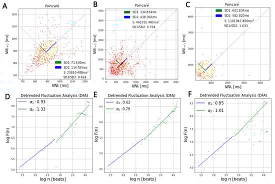 Poincaré and DFA plots for ECG REF (A,D) and ECG EXP with keyboard (B,E) and keyboard/mouse (C,F).