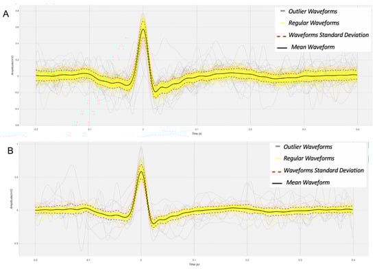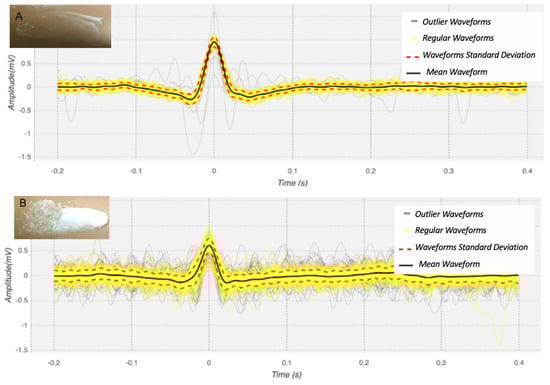 In order to illustrate the individualized heartbeat waveforms, in Figure 5 we visualize the heartbeat waveforms considered valid represented in yellow and the heartbeat waveforms considered outlier represented in gray. Furthermore, in order to represent the statistical analysis of the waveforms obtained with the materials that showed better performance, the Table 4 presents the values of Pearson’s correlation coefficient and Normalized Root Mean Square Error (NRMSE). Based on the results of Section 4.2, which were subsequently confirmed experimentally, it can be proven that the signals obtained by the proposed device (ECG EXP) are correlated with the reference signals (ECG REF).