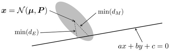 Figure 1. An illustrative figure showing an image feature pixel x represented as a two-dimensional random variable with mean μ and covariance matrix P ; the epipolar line is represented as a straight line with equation a x + b y + c = 0 , min ( d M ) is the minimum Mahalanobis distance, while min ( d E ) is the minimum Euclidean distance. In standard 8-point algorithms, the (inverse) Euclidean distance is used as the weight, while our method utilises the Mahalanobis distance which is statistically more consistent (shorter distance to the line in this example).