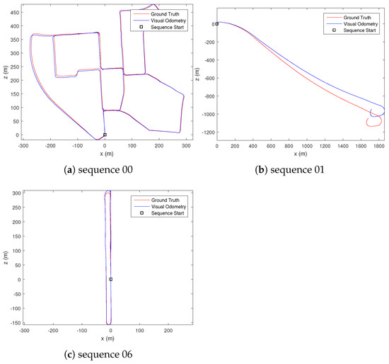 The uncertainty estimate for the dense optical flow is visually inspected, where it was observed that occluded, out-of-bound, or textureless regions of the image have high uncertainty value. For ground-based vehicle’s visual odometry result, we compare our performance with existing methods, specifically VISO2-M [22], MLM-SFM [10], PMO [11] and DOF-1DU+LC [36]. We selected a few of the available sequences that contain a slow-moving vehicle in an urban environment (sequence 00), a fast-moving vehicle on a highway (sequence 01), and a vehicle traveling in a loop (sequence 06) to gauge the performance of our proposed methods. The results are summarised in Table 1 and Table 2. Note that VISO2-M [22] and MLM-SFM [10] methods fail to estimate the visual odometry for sequence 01 due to the highly repeated structures of the scene, which cannot be reliably matched by the sparse feature-matching technique their methods employ. Figure 5 shows our estimated trajectory for the vehicle’s motion. From the estimated motion trajectory (Figure 5) and computed error from the ground truth (Table 2), we can observe that our proposed method achieved a very accurate estimation of translation. This result is achieved without using bundle adjustment, motion model, or ground segmentation used by other state-of-the-art techniques. From Table 1, we can also observe an improvement in the rotation estimate after fusing the Mahalanobis eight-point algorithm and PnP result.