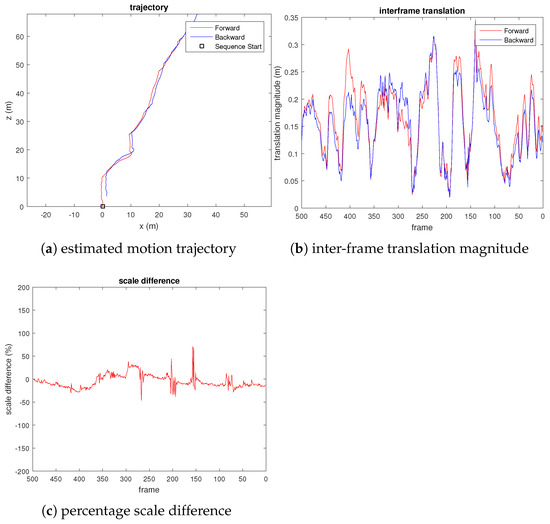 The use of scaled-down images (one-third of the original scale) for dense optical flow estimation cannot guarantee the accuracy of the matches when the pixel translation between two images is too small. This case occurs when the vehicle moves very slowly or hovers, causing the motion estimation to be error-prone. Small translational motion estimation is a common problem in most monocular visual odometry, as the small parallax between two images leads to difficulty in estimating both motion and structure accurately. Two conditions determine the sufficient parallax. First, the Shi–Tomasi corner matches have a median displacement magnitude of at least 2.5 pixels. Secondly, the third quantile (75%) of the computed optical flow is larger than 5 pixels. Suppose either of the two conditions is not met. In that case, the inter-frame motion is computed only from the PnP method using the previously calculated depth and the motion of the corresponding pixels.
