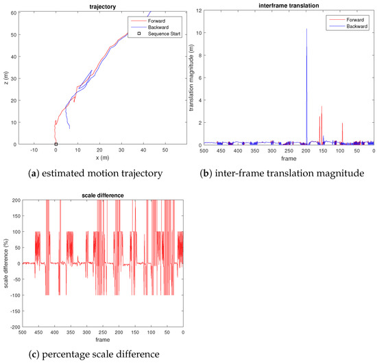 Figure 7. Plots evaluating the scale drift of VISO2-M [22] visual odometry on UAV video, where percentage scale difference refers to the percentage error of the translation magnitude compared to the true translational magnitude.