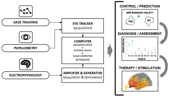In this perspective, we showcase three example applications of eye-tracking: (1) in predicting memory performance in healthy subjects, (2) in an assessment of reading comprehension in post-comatose patients, and (3) in the level of consciousness in patients with acquired brain injuries. These applications provide case studies for using the noninvasive signals from pupil size or position on a computer screen to measure cognitive processes in the brain. Hence, they fulfill the criteria for an indirect BCI mediated through the eye. It is qualitatively different from a clinical examination of the pupil or gaze responses by delivering objective measures of cognitive processing that can be used as feedback for a computer-generated response in the form of a diagnostic assessment or a therapeutic intervention such as brain stimulation. Figure 1 summarizes the general circuit design for such eye-tracking BCIs, which is common in each of the examples described below. In general, gaze tracking and pupillometric signals are sensed independently or complement electrophysiological data for computer analysis of output responses feeding back to the user or directly to the brain. An analysis of the signals and any simulations can be efficiently performed in open-access (e.g., Python) or commercially available (e.g., Matlab and MathWords Inc.) programming environments.