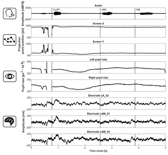 Example gaze tracking, pupillometric, and electrophysiological BCI input signals recorded in a patient with intracranially implanted electrodes during recall of three words.