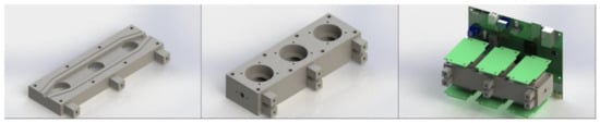 The 6-slotted sensor chamber layout. (left) lower part of the chamber; (middle) assembled chamber; (right) assembled chamber with attached sensors and circuit boards.