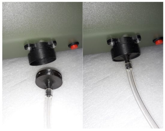 The sensor enclosure was made of lightweight composite material shaped with CNC milling and it was spray-painted with army green spray paint (Figure 1). The design had to meet specified requirements, which included the following: (a) sufficient room for the chamber with sensors, power supply, pump, and electronics; (b) possibly a flat box to hitch under the UAV; (c) compromise of the horizontal position of the sensor chamber and possible vertical tubing connection, obtained by bias at the bottom of the enclosure; (d) design of the enclosure to be watertight and gastight to avoid damage of the internal parts when operating in rain or a corrosive environment, the housing thus being a fold of two shells with a rubber seal.