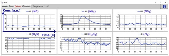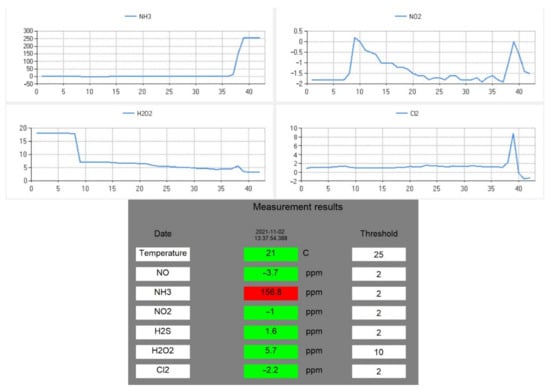 A schematic drawing of the laboratory setup is presented in Figure 4a. The tests were carried out at the Institute of Optoelectronics, at the Military University of Technology. We also investigated potential problems appearing during measurements, amongst other issues related to the sensors’ cross-sensitivity, which were apparent during tests, and were noted by the manufacturer in the specification sheets [26]. This problem has also been previously reported in the literature, and it is common for electrochemical sensors [27]. Ammonia and H2O2 were analyzed using vapors of the substances from their solutions in water. The responses of the sensors were also tested using gases and vapors from the above concentrated solutions of HCl, HNO3, and H2SO4. Since the project was focused on the detection of target gases or vapors, calibration of the sensor was not necessary. However, the software allows implementation of the calibration curve based, for example, on reference device readings. The sensor readings were compared as arbitrary units (a.u.) relating to the recorded electrical signal. Example of the data displayed during the measurement are presented in Figure 5.