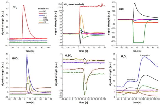 Specific sensor responses to different gases and vapors from above solutions of NH3 (in the range of measured concentration and saturation), HCl, HNO3, H2SO4, and H2O2. The I and II aspiration on the H2O2 plot refers to moving the aspirating tubing in and out of the place of gas emission. Some sensors show negative response that occurs for some gases and cannot be treated as a real physical result. Since sensors are calibrated to a specific redox reaction, another gas can produce reversed current on the electrodes.
