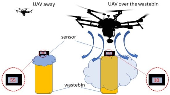 The downwash problem is commonly known and has been widely discussed when the UAV–gas sensor combination has been studied. The rotating propellers produce strong and turbulent airflow under the aircraft, which can dilute or even push the air mass, thereby removing the target gas. Therefore, the downwash can significantly affect the sensor’s readings, due to the altered gas concentration below the UAV [1,31,32,33].