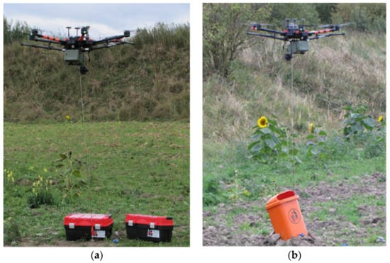 During the project, we performed testing of the ChemDet detector on UAVs of several sizes and, consequently, different payloads. Different disturbing effects on the measurements were also observed. The first version of the ChemDet was tested on the UAV (DJI Inspire 2–not shown), while its final version was tested on the UAV (DJI M600) shown in Figure 8.