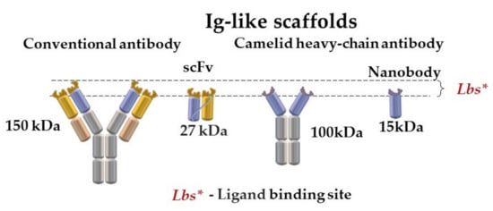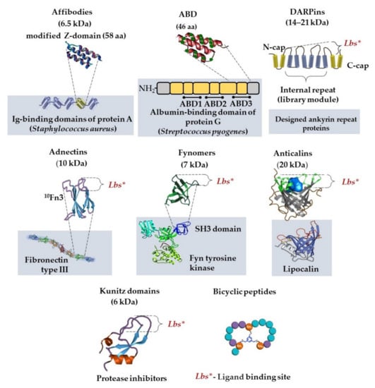Great attention has been paid worldwide to alternative antigen-binding molecules of a non-immunoglobulin nature, scaffold proteins, as a promising biotechnological tool (Figure 1). This actively expanding group includes adnectins, affibodies, anticalins, bicyclic peptides, DARPins, fynomers, and Kunitz domains [,,]. These proteins have several advantages, which makes them a successful alternative to antibodies (Table 1 and Table 2).