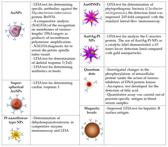 The distinctive features of some nanomaterials, such as tunable optical properties, the ability to self-assemble, and catalytic and ferromagnetic activity, make them attractive for use in the latest immunoassay systems. For about half a century, gold nanoparticles (NPs) have been used as a marker in immunochemistry. Due to the simplicity and speed of application, immunochromatographic test systems have now become very popular and are widely used. Figure 4 summarizes the application data and the various types of nanoparticle modifications described below.