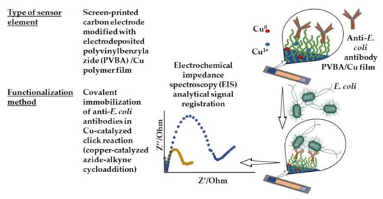Sensors for voltammetry have been improved. An original method of covalent immobilization of anti-E. coli antibodies on the surface of screen-printed carbon electrode by the copper-catalyzed azide–alkyne cycloaddition reaction was developed [] (Figure 5). A polyvinylbenzylazide film was applied to the electrode surface by the electrochemical method with the simultaneous inclusion of copper-containing particles in the structure. The modified electrodes were characterized by scanning electron microscopy, electrochemical impedance spectroscopy, and cyclic voltammetry. As a result of electrooxidation, Cu+1 ions were formed, which catalyzed the “click” reaction, which reduced the immobilization time of the immunoreceptor (antibodies) to 30 min. The developed label-free impedimetric immunosensor for E. coli detection demonstrated high stability and selectivity with respect to target bacteria. The detection limit was 6.3 CFU/mL, with a linear range of 103–106 CFU/mL.