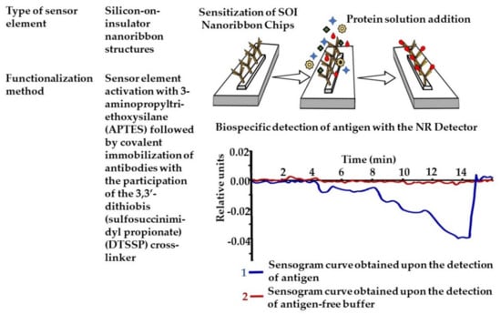 According to the current definition by the International Union of Pure and Applied Chemistry (IUPAC), a biosensor is a self-sustained integrated bioreceptor/transducer device intended to obtain selective quantitative or semi-quantitative analytical information using a biorecognition element []. A major part of developed devices are laboratory models and do not come into wide use. However, when speaking of affinity sensors, what is often meant is molecules or supramolecular structures specific to certain ligands and used in combination with special registration equipment. The main required parameters of affinity sensors are their detection rate, specificity, sensitivity portability, simplicity, ability to work with low sample volumes, and low cost []. The efficiency of affinity sensors depends on such factors as their ability to immobilize recognition elements (biological molecules) while preserving their natural activity, the accessibility of the recognition element for the relevant analyte in solution, and low, non-specific adsorption on a solid support. In this connection, high requirements are imposed on biosensors’ recognition molecules. The ligand should be highly specific, stable, and economical in production. For this reason, one of the main types of biosensors is biosensors based on antibodies.