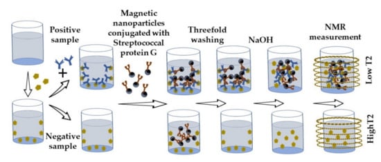 - Khramtsov, P.; Kropaneva, M.; Bochkova, M.; Kiselkov, D.; Timganova, V.; Zamorina, S.; Rayev, M. Nuclear magnetic resonance immunoassay of tetanus antibodies based on the displacement of magnetic nanoparticles. Anal. Bioanal. Chem. 2021, 413, 1461–1471. [Google Scholar] [CrossRef] [PubMed]
